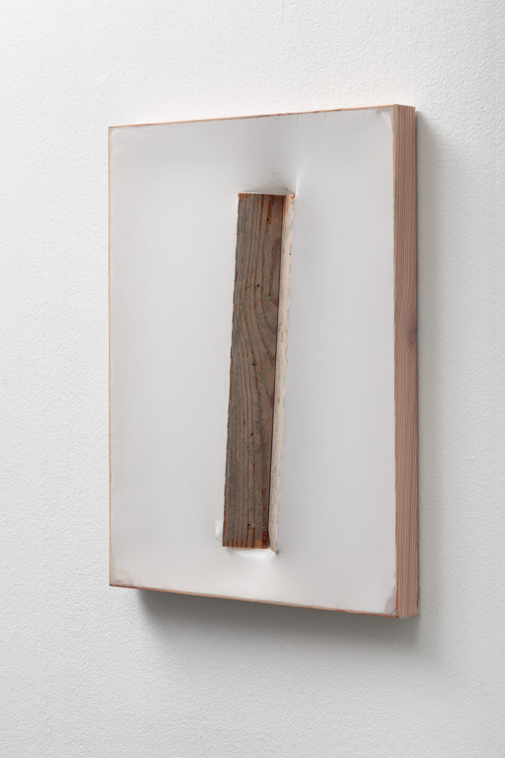 Novotný has a dog that barks a lot. His barking can often be heard from a distance when passers-by approach the house. He is often interrupted in his thoughts and work, and then has to start all over again. But the dog also often lies quietly outside the door, perhaps watching the fruit trees through which the sun shines alternately. He is not afraid of what is under the grate on which he lies, of emptiness and wet leaves, as most dogs would be. His fur grows through the metal mesh and the heat from his body spreads out into the cold construction. The reality of the place, a former farmhouse not far from Prague where the life of the capital is increasingly permeating and where the artist has a studio and now a home, is inscribed in a series of his latest small-scale works. He refers to it modestly, using phrases such as “a few private things”, “reality”, “moving away from large-format monochromes”. The thin sheer fabric in rolls merging with the heterogeneous objects that surround him create his habitat. He perceives disruptions from the work process in the form of a neighbor’s sawbench, a communal radio, or a bird’s encounter with the glass panes of his studio. The importance of each event, however, inevitably dissipates over time. The sequence of sparse installations deliberately displayed in the gallery’s courtyard reflects and reinforces this lived reality – the leaps out of set processes, only to then slowly fade away.