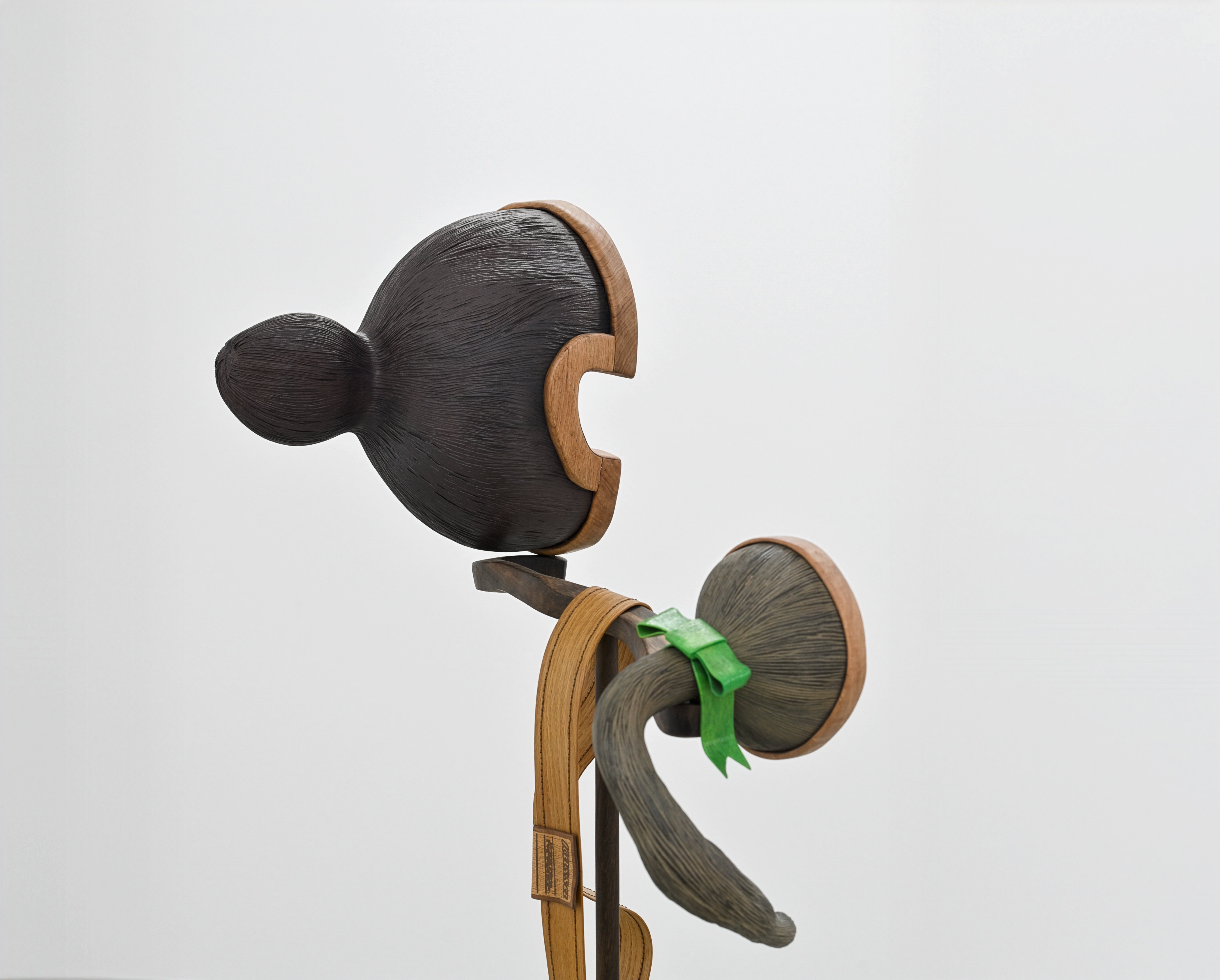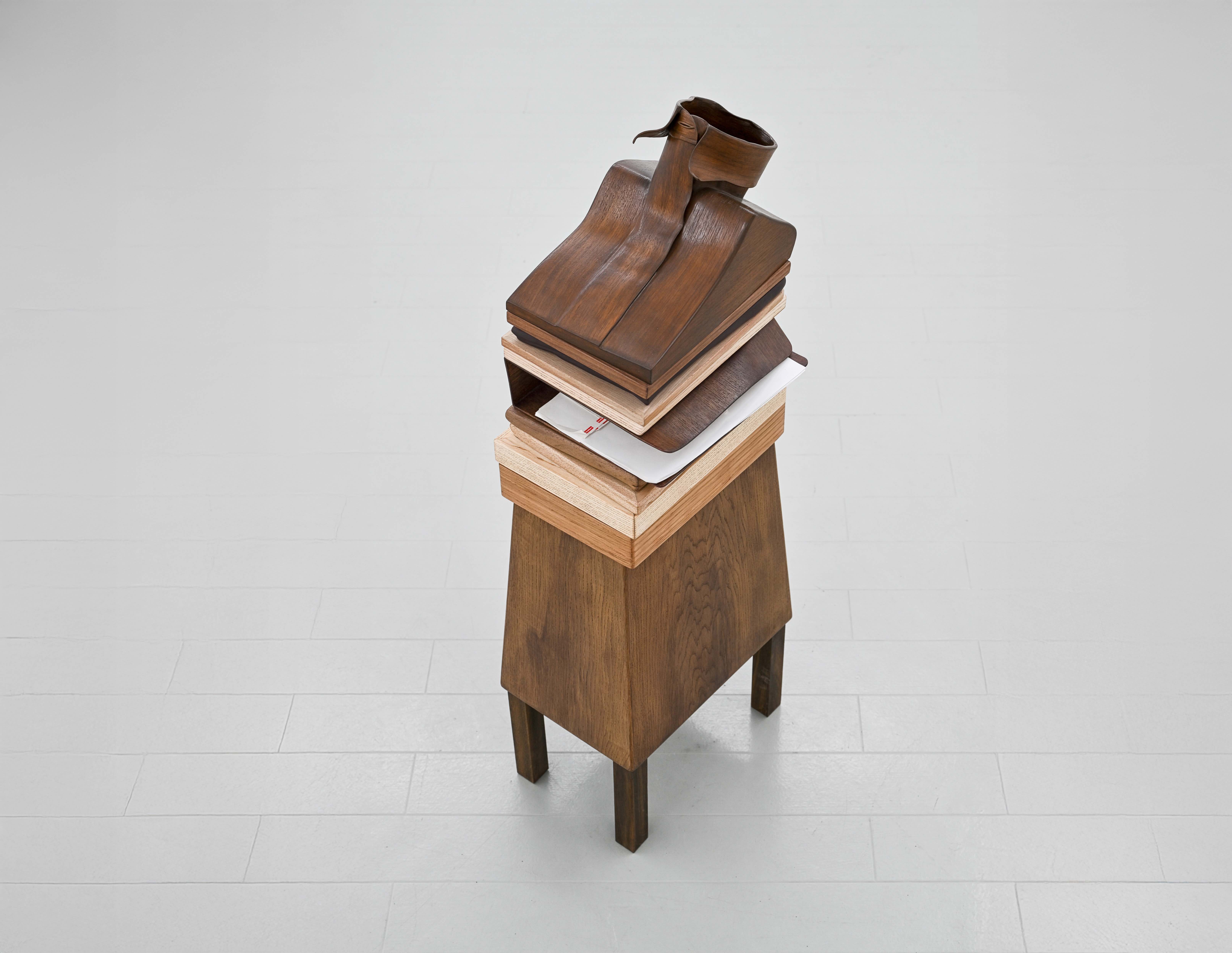 The accountant emerges here less as a profession than as a figure of alienation and moral ambiguity. Wooden shirts stacked together with documents like chimneys or „seated column of clerks“ suggest a fragile architecture of discipline; a discipline held together until it buckles. The briefcase, emptied of its value, becomes a container of absence, a missing link of belonging, or an echo of Vermeer’s pearl earring: what counts as precious and useful, and to whom? Zippers register as sites of agony, moments where closeness and intimacy falter. Scale and dimension play a crucial role in Izsó’s practice. Objects oscillate between the monumental and the ordinary, the rigid and the limp, resulting in the collapses of hierarchy, whether in material or meaning. At times they ridicule their own anthropomorphic qualities, as though objects themselves were burdened with human traits, longing, or failure.