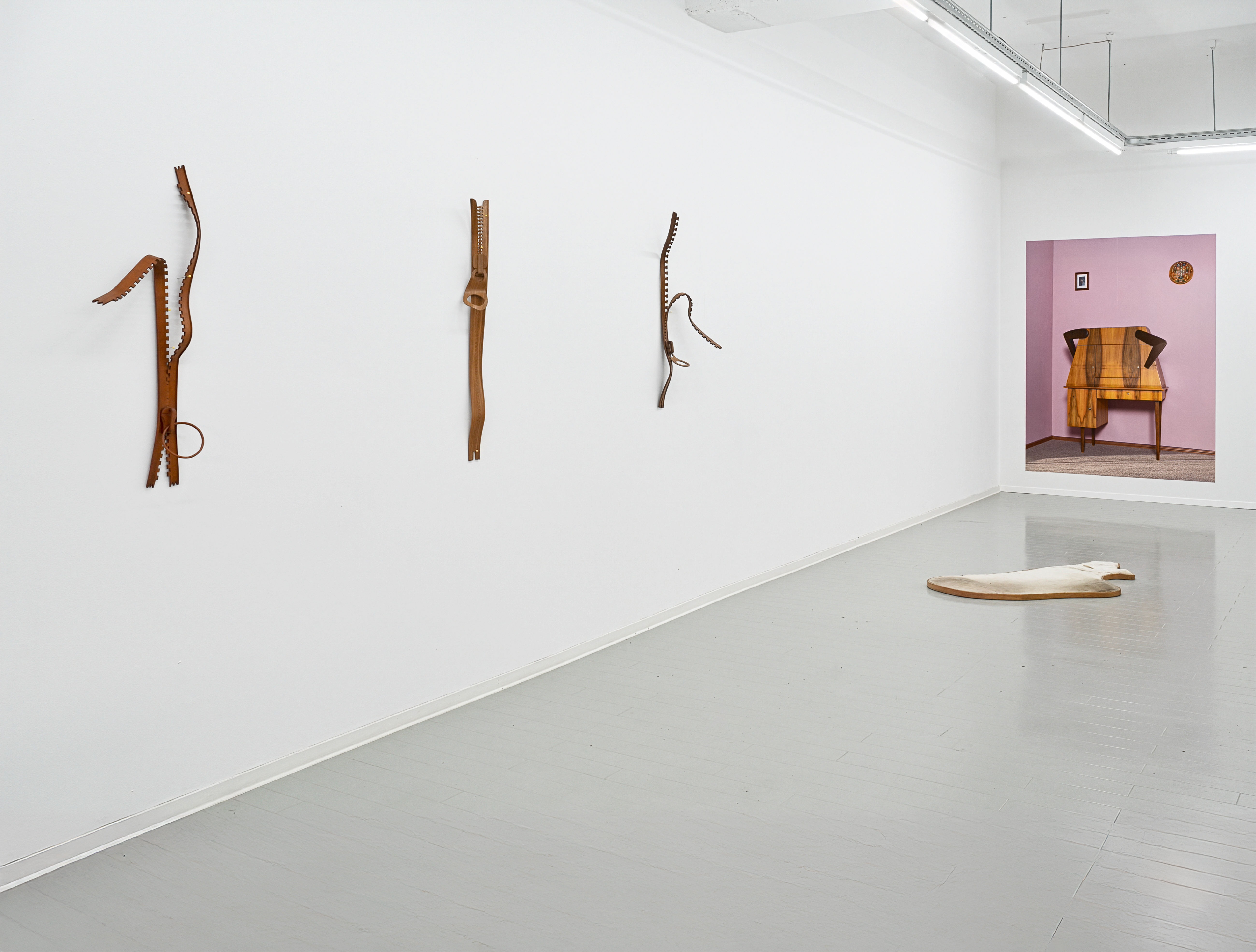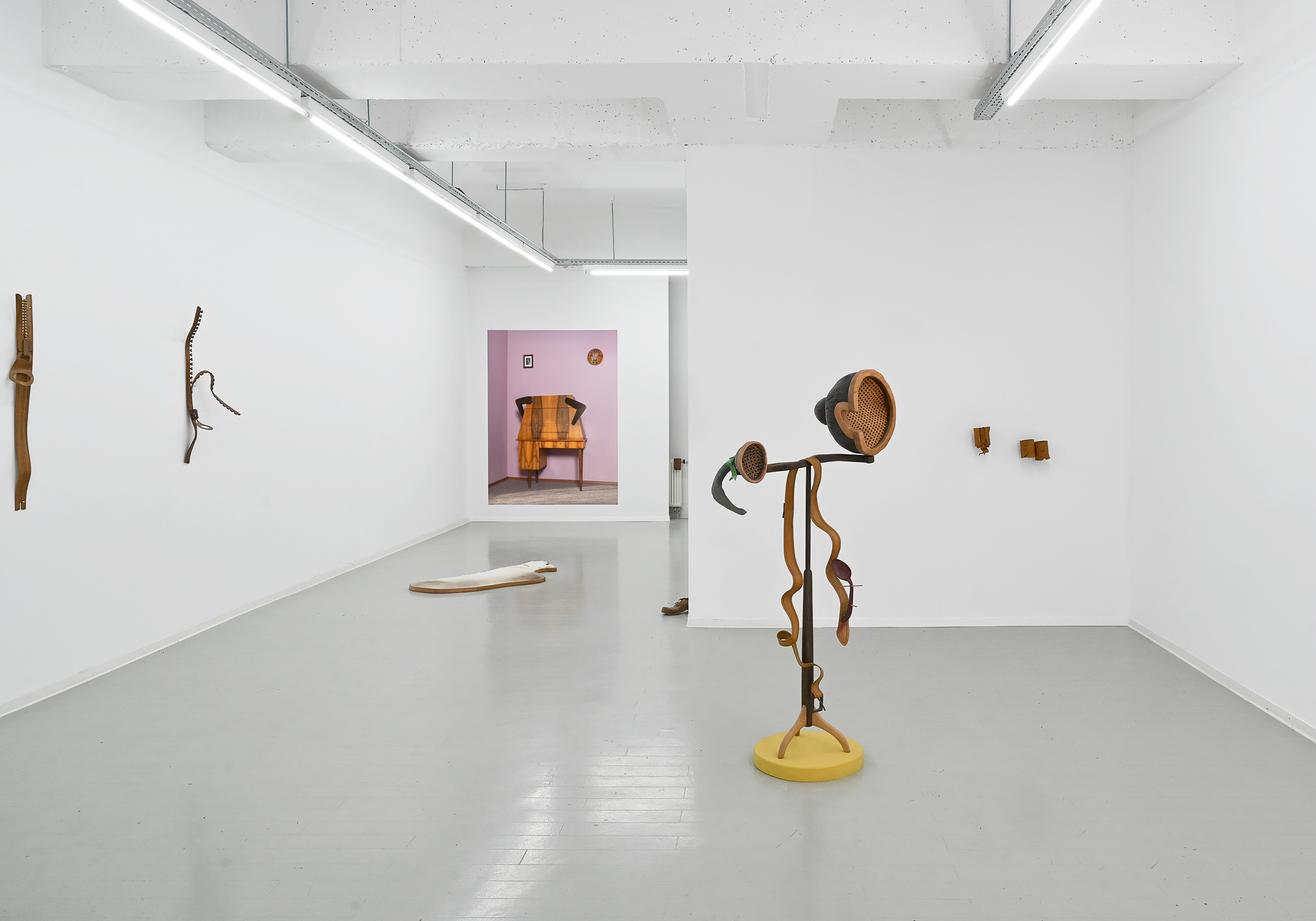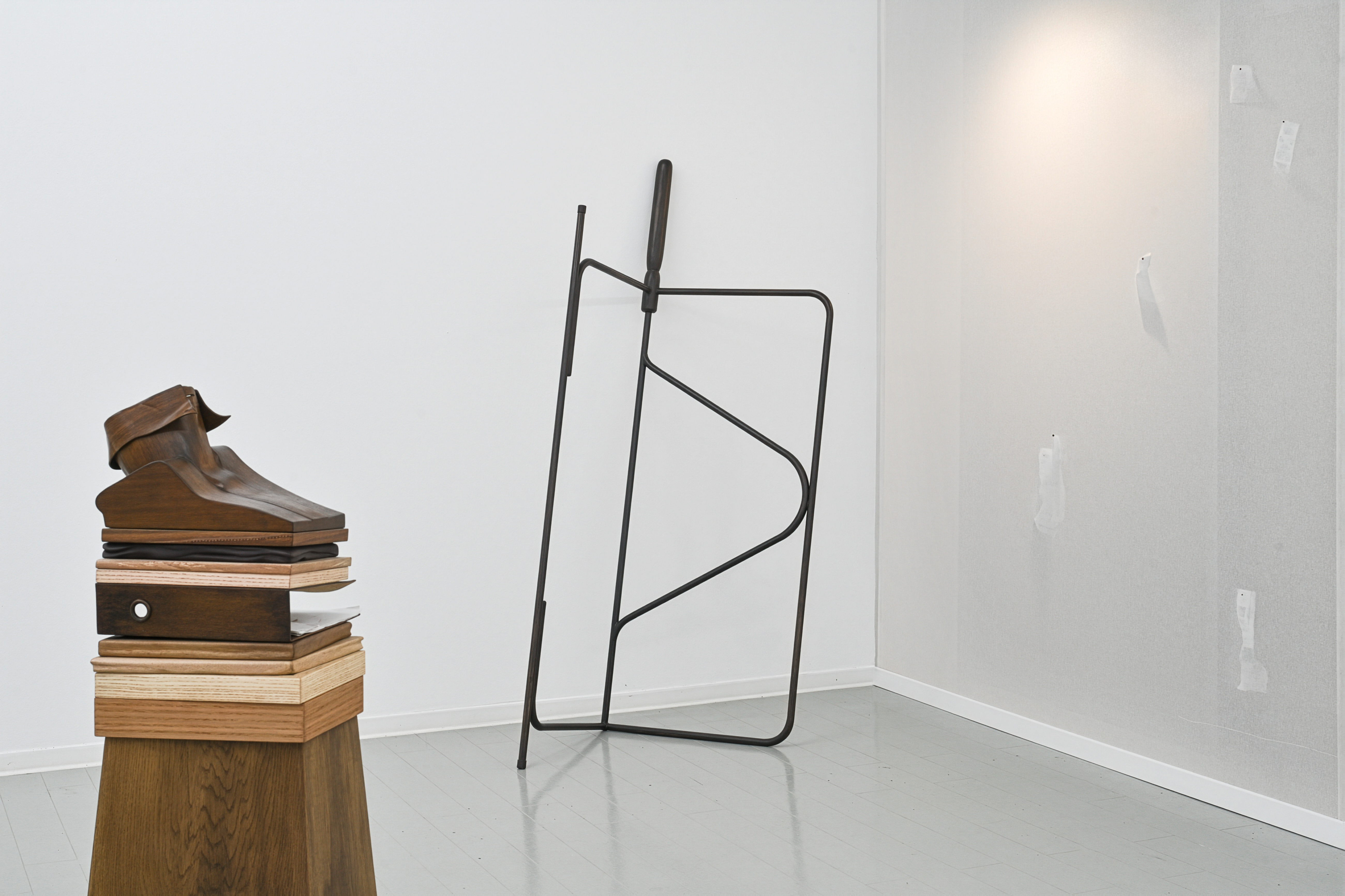 Izsó’s practice revolves around interconnection, whether formal or metaphorical. He navigates the tension between soft and rigid, body and shell, public routines and domestic rituals. Starched shirt cuffs, sagging belt veneers, an empty briefcase, or an outstretched, more-than-life-size sock, each of these objects subverts expectations not only in terms of their material, but above all in terms of what is socially expected of them. Wood bends into absurd zippers, textiles stiffen into wooden husks, and functionality dissolves into poetic defeat. The mundane and familiar turns uncanny evoking a stillness, passivity or even paralysis akin to Bartleby's famous phrase from the book “I would prefer not to” at the heart of bureaucratic order. Barleby's refusal is a refusal where the carefully constructed boundaries between private and public collapse – what at first glance appears representative, polished, and proper at second glance (or in the backroom) becomes uncertain and hesitant.