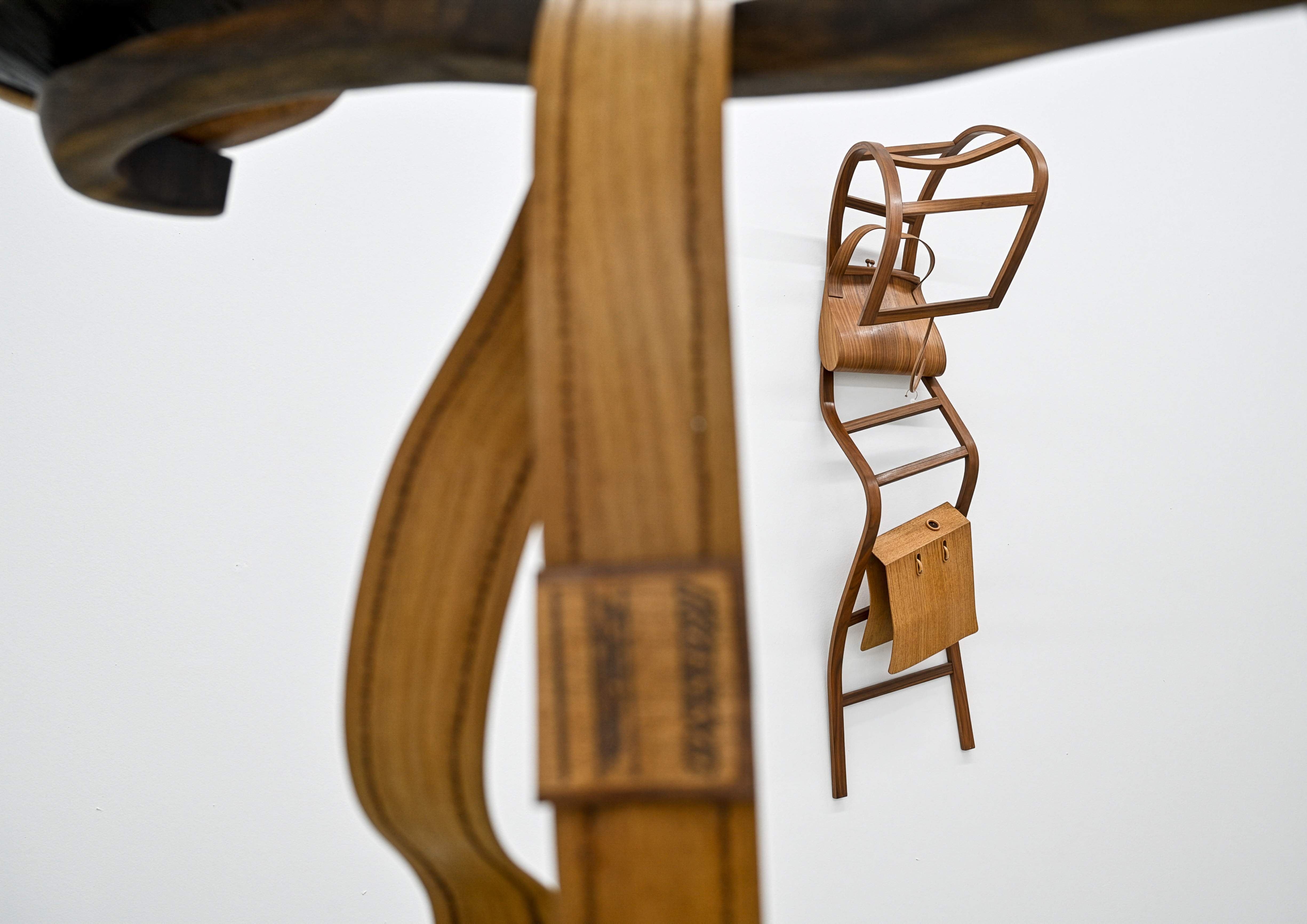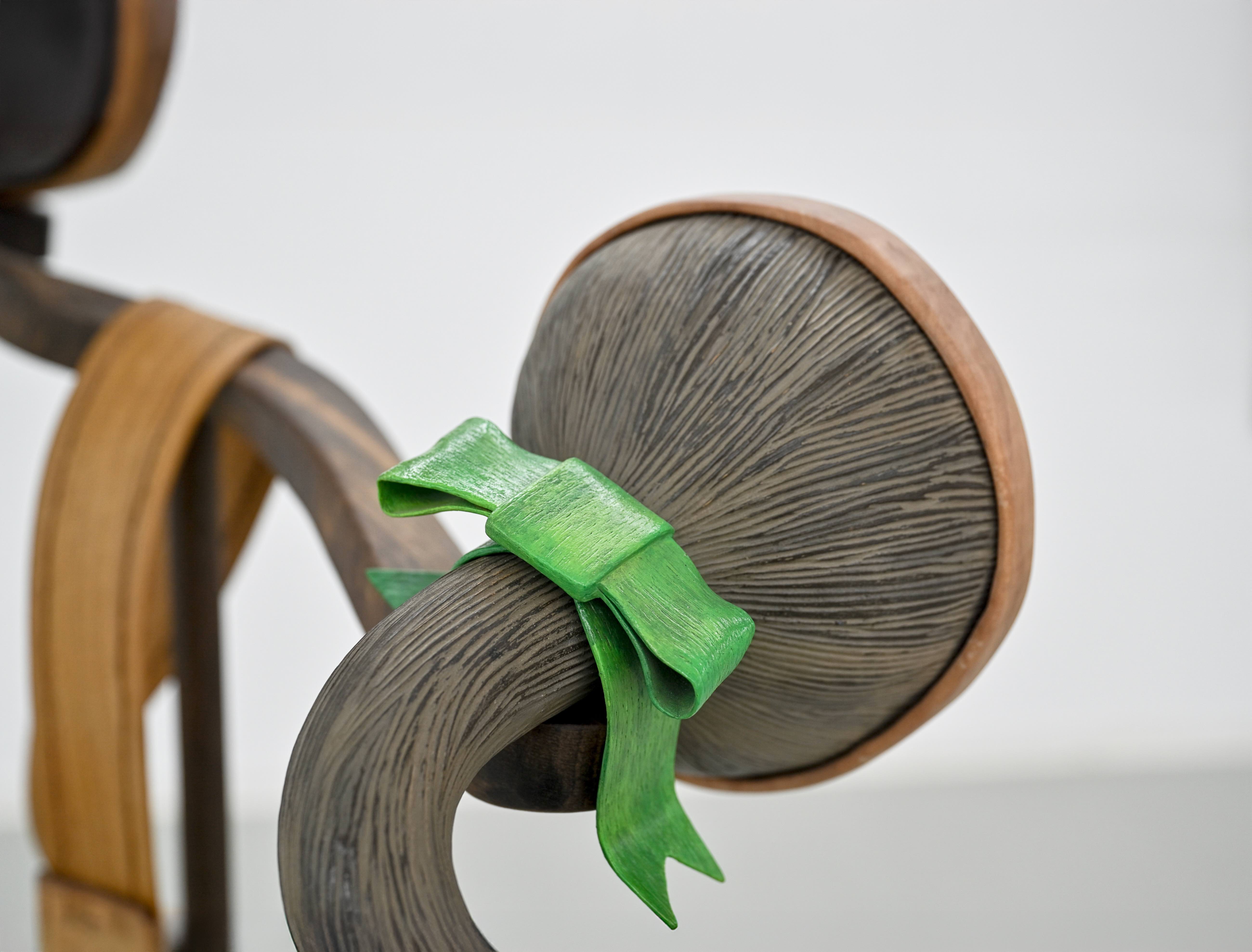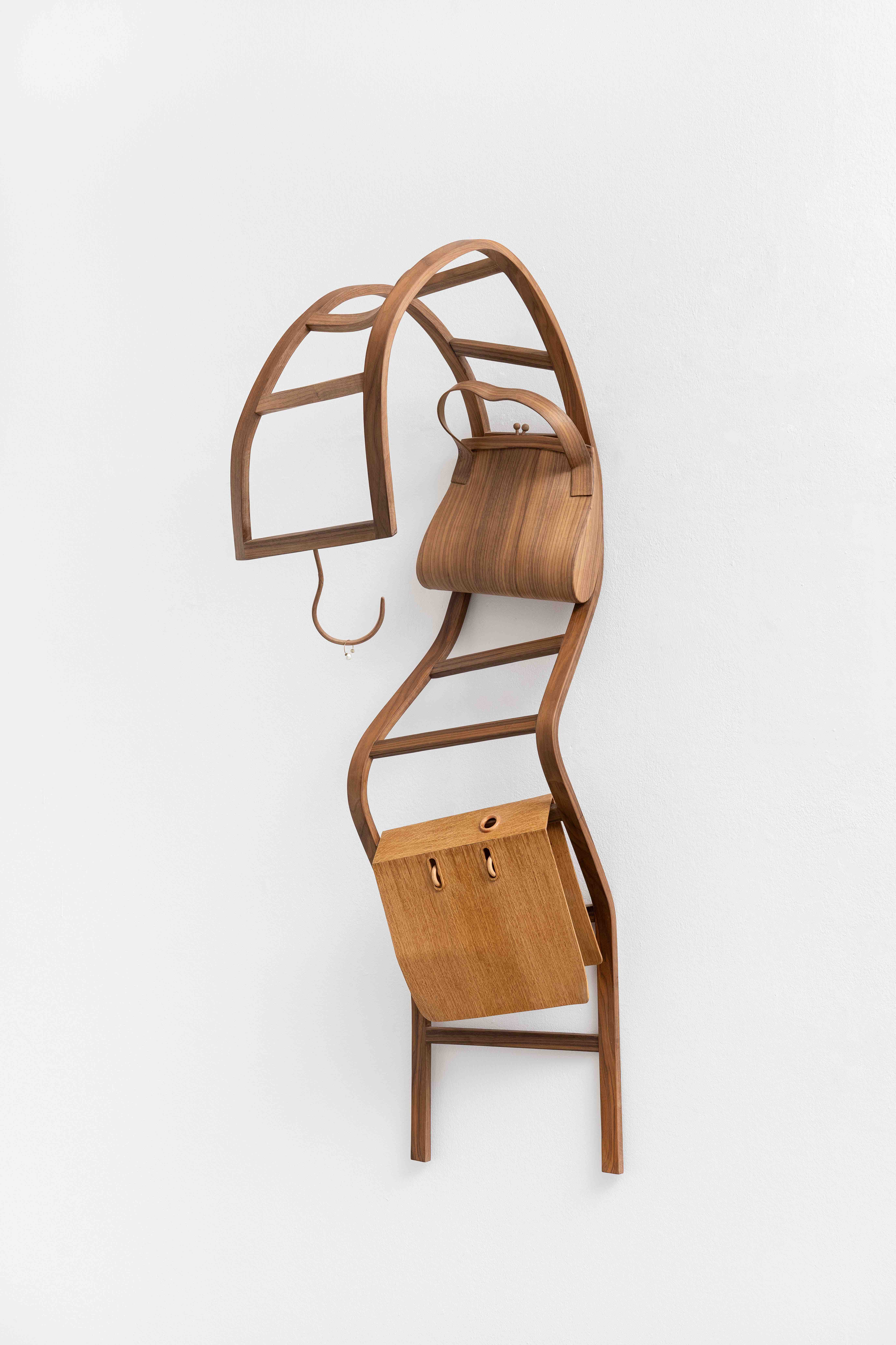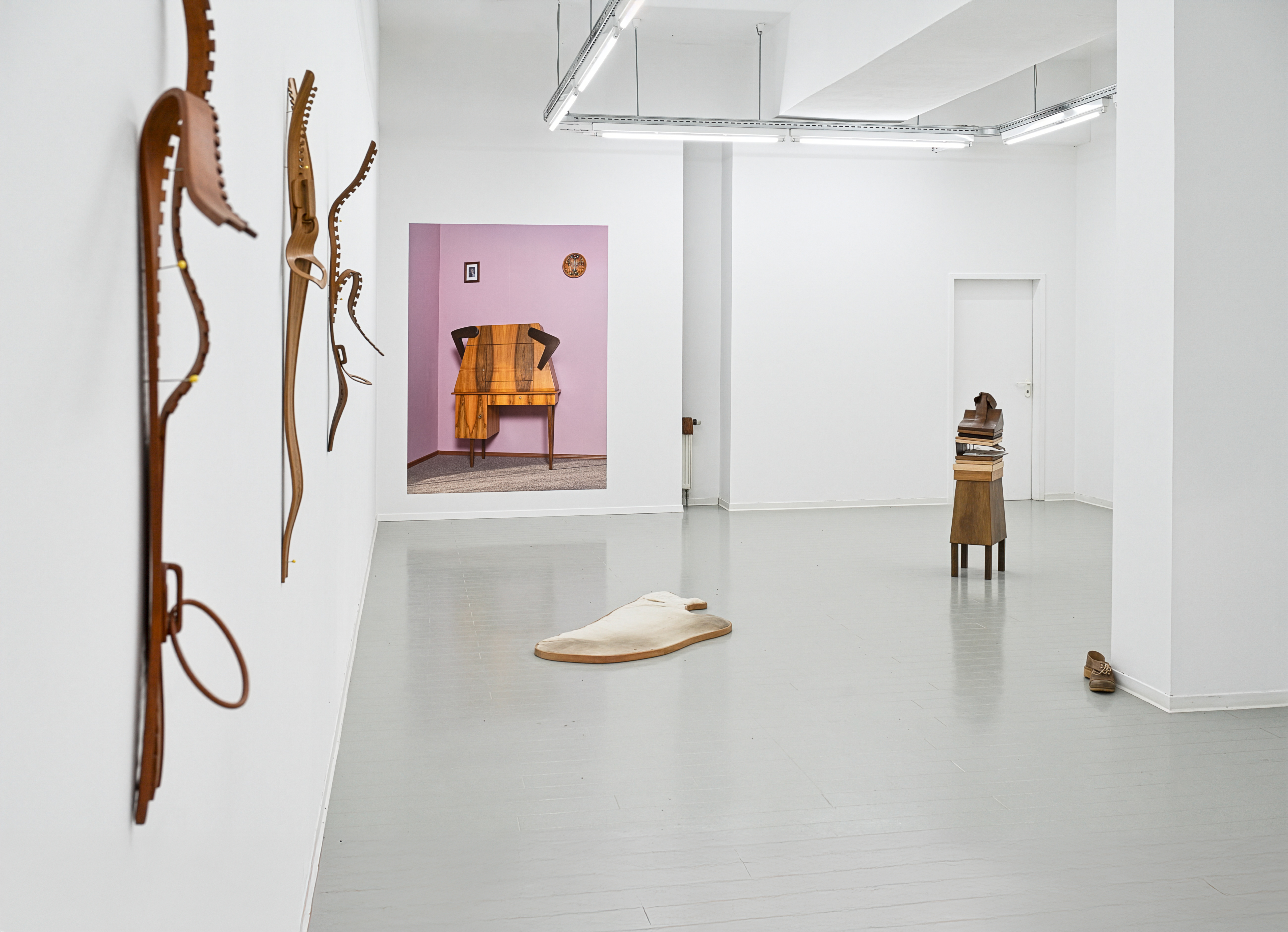 Izsó’s practice revolves around interconnection, whether formal or metaphorical. He navigates the tension between soft and rigid, body and shell, public routines and domestic rituals. Starched shirt cuffs, sagging belt veneers, an empty briefcase, or an outstretched, more-than-life-size sock, each of these objects subverts expectations not only in terms of their material, but above all in terms of what is socially expected of them. Wood bends into absurd zippers, textiles stiffen into wooden husks, and functionality dissolves into poetic defeat. The mundane and familiar turns uncanny evoking a stillness, passivity or even paralysis akin to Bartleby's famous phrase from the book “I would prefer not to” at the heart of bureaucratic order. Barleby's refusal is a refusal where the carefully constructed boundaries between private and public collapse – what at first glance appears representative, polished, and proper at second glance (or in the backroom) becomes uncertain and hesitant.