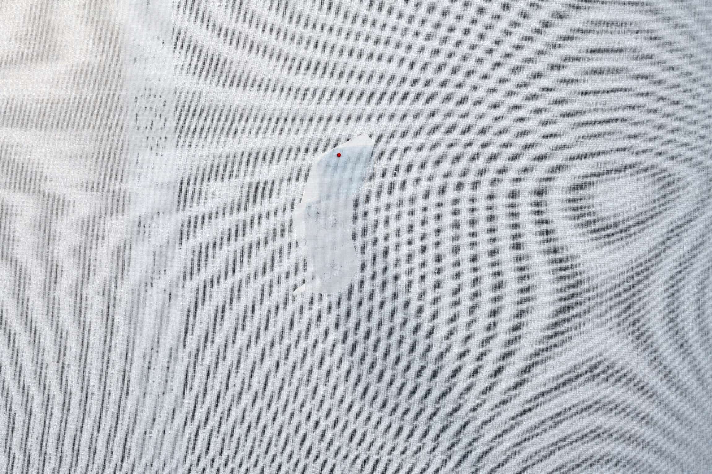 Izsó’s long-standing engagement with interior spaces, office and café-like, and the inherited rituals of everyday life is deeply rooted in the displayed works and its conscious subversion. Elements of past epochs appear as photographic illusions or fragments re-situated in the present. Their surfaces carry both historical comfort and contemporary dissonance as in exposing bourgeois habits such as sitting with a newspaper holder in cafés or carefully managing one’s appearances as hinted by shelved toupee. Money laundering, like trying to hide dirty linen, leads to situations reminiscent of the structure of fragile veneers, which become adaptable by mimicry on the surface.