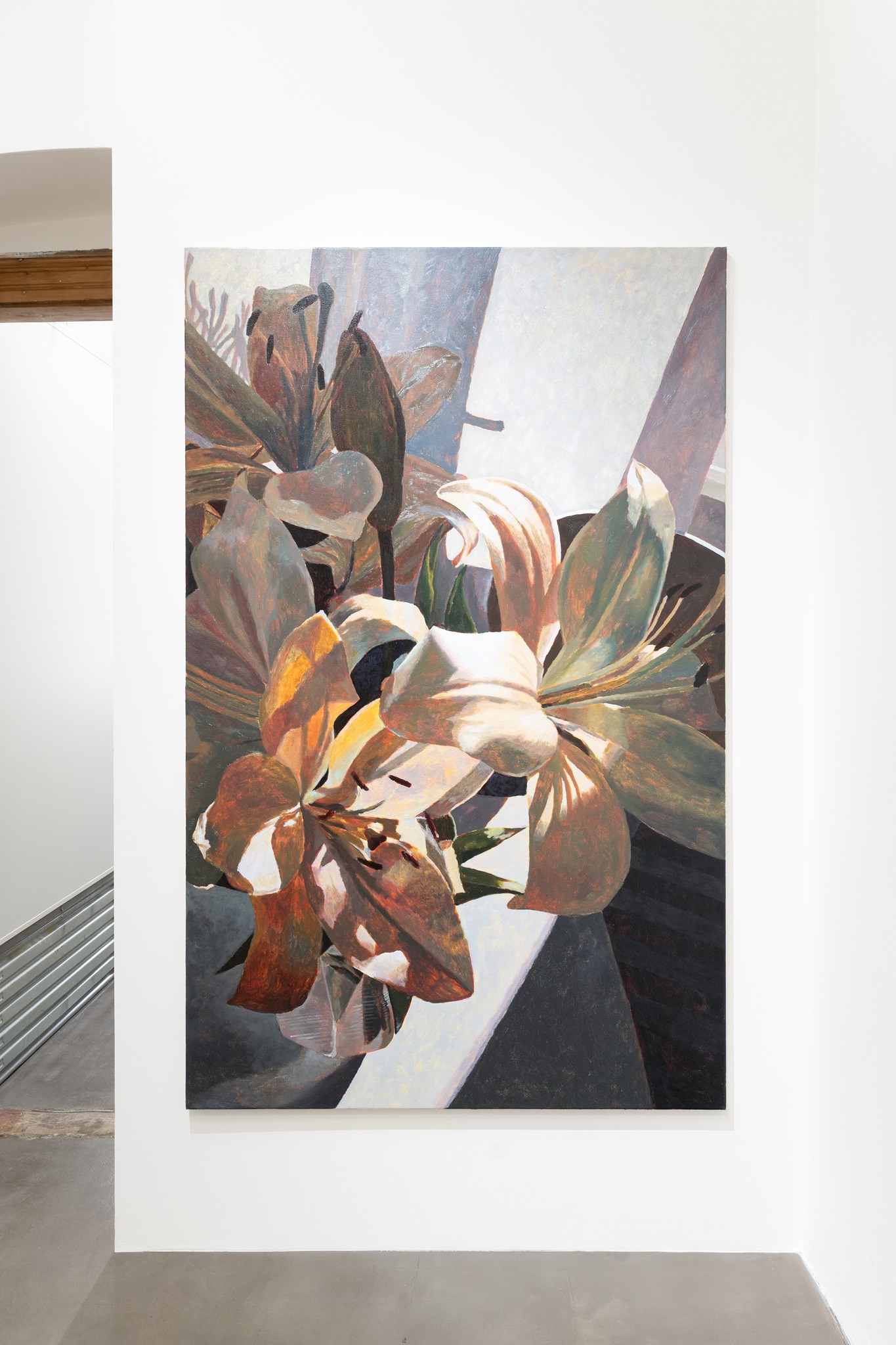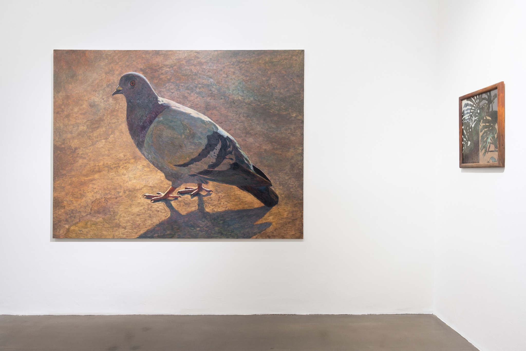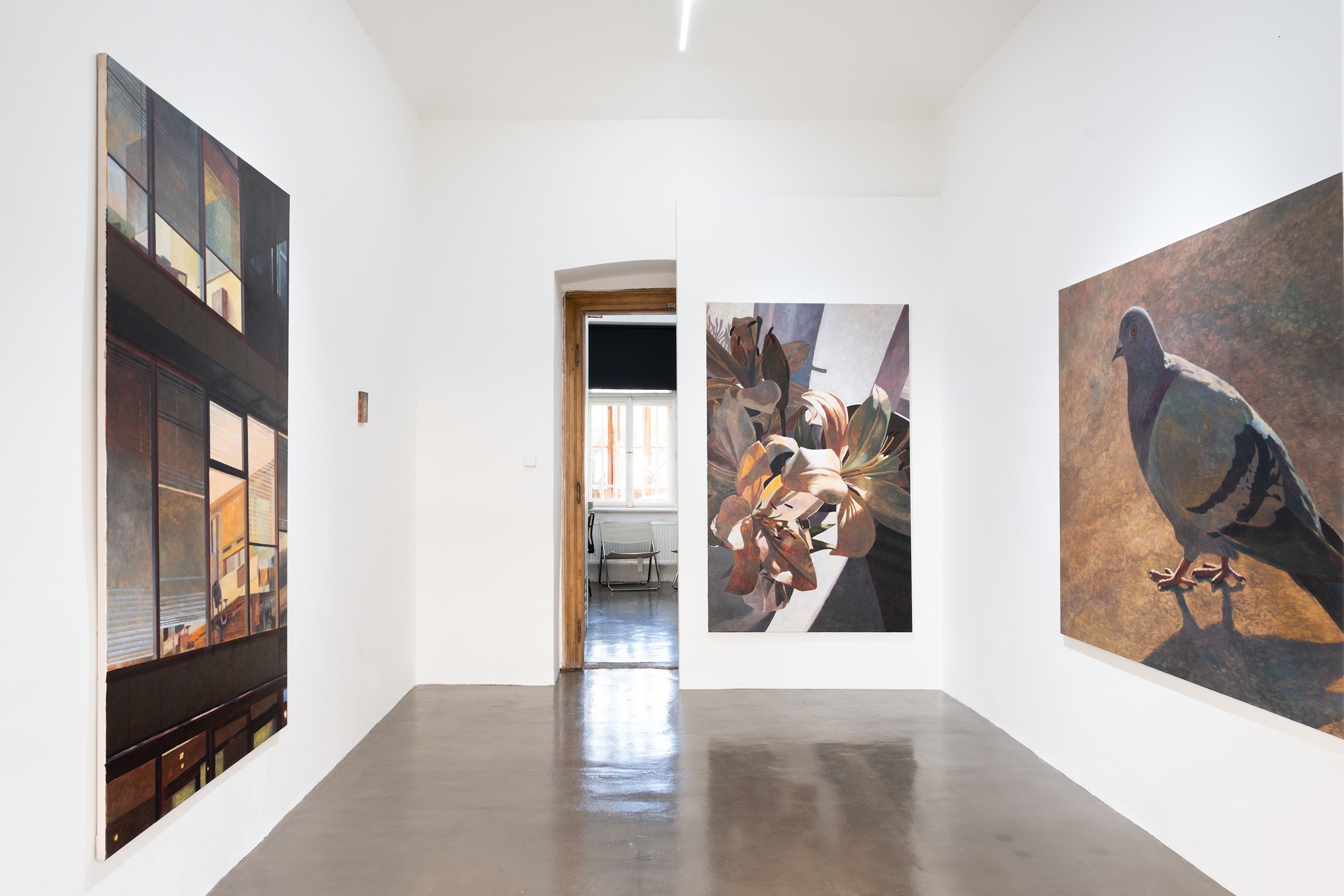 The canvas with a larger-than-life pigeon builds on the aforementioned contemplation of the intertwining of different planes of contemporary cosmopolitan experience. Cornelia Sollfrank and Felix Stalder also clearly highlight this entanglement in their book Contemporaneity in Embodied Data Practices (2025), where, in addition to describing individual, natural, and historical-cultural levels, they also identify a technological-data plane. The authors illustrate this idea using a study on the rewilding of migratory birds: The birds are tagged with tracking devices, and, thanks to the data they collect, the animals can then be released back into the wild without further human intervention. This creates a new type of relationship between the living, the non-living, and the technological, which under certain conditions can take on symbiotic qualities. The opposite mechanism can be observed in pigeons: While in ancient times they were valued as tireless messengers with the exceptional ability to navigate across hundreds of kilometers, with the development of technology they were gradually reclassified as unwanted urban pests. Next to disused balconies covered in bird droppings and hallway corners decorated with monsteras, we see coffee tables with vases of lilies, which have been analogously pushed aside. Their pungent scent, richly colored pollen, and potential toxicity have transformed these once-revered flowers, which have strong spiritual symbolism, into outdated gifts that do not fit into the sterile framework of contemporary professionalism.